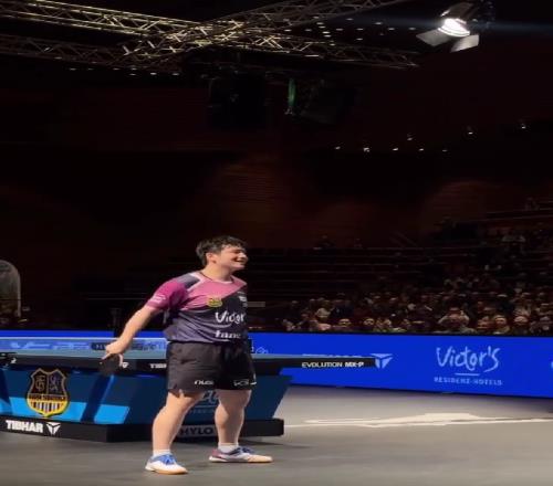 落地时,樊振东展露出一脸腼腆的笑容,粉色球衣与霸气庆祝动作形成强烈反差,被球迷调侃为"奶凶版致敬"。