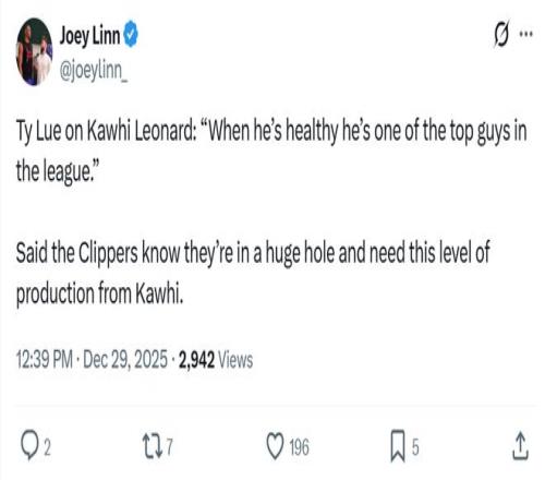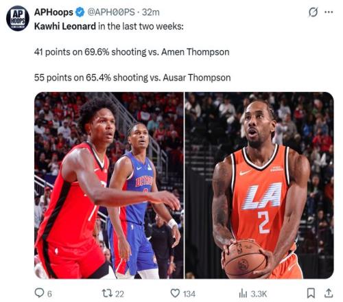 面对小卡这样的表现,快船主帅泰伦卢自然喜不自胜:“当莱昂纳德保持健康时,他就是这个联盟中最强的球员之一,我们正处于一个巨大的困境中,真的需要他这样的表现。”