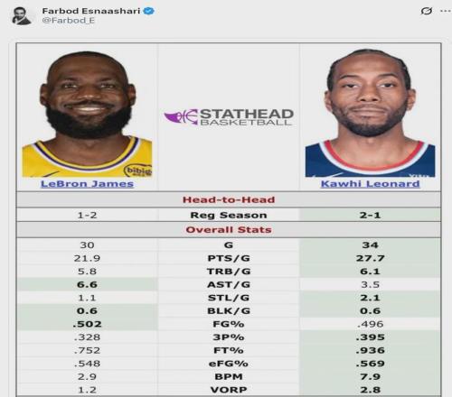 太阳记者Shane Young和快船记者Farbod Esnaashari为伦纳德鸣不平,认为伦纳德比詹姆斯本赛季更出色。小卡本赛季打了34场比赛,场均27.7分6.1篮板3.5助攻2.1抢断;詹姆斯打了30场比赛,场均21.9分5.8篮板6.6助攻1.1抢断。