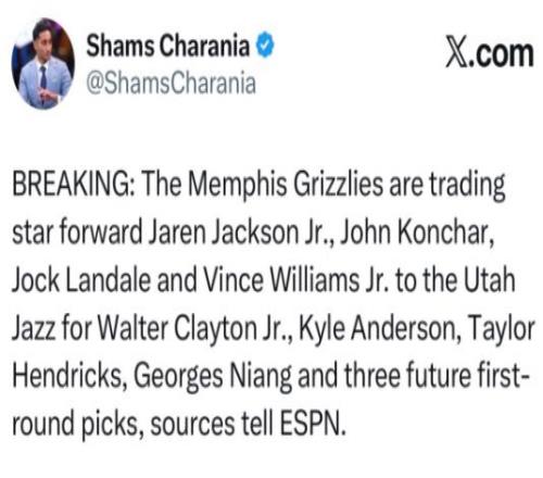 爆料王Shams:灰熊将3J+康查尔+兰代尔+小文斯-威廉姆斯送至爵士,换回李凯尔+小克莱顿+亨德里克斯+尼昂+三个首轮签。