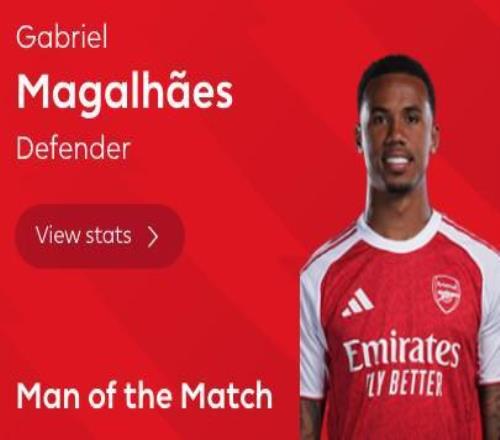 打破僵局,加布里埃尔当选阿森纳vs维拉全场最佳球员 -